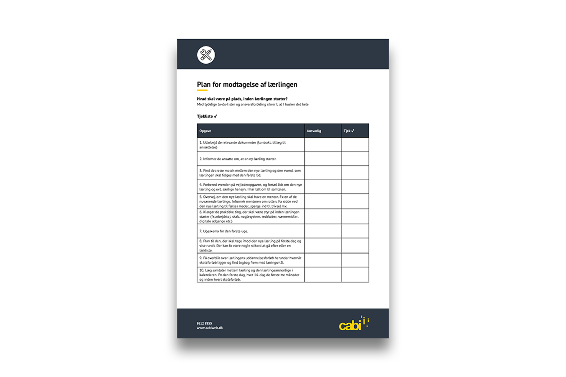 Du får også tjeklister og forslag til spørgsmål, som hjælper dig med at sikre, du ikke glemmer ting, der kan være væsentlige for, at både kollegaer, lærlingen og du som leder får en god start på samarbejdet.